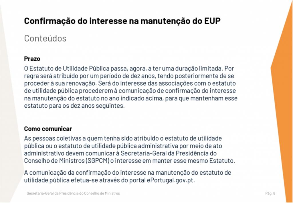 Alertamos e informamos todas as entidades a quem tenha sido atribuído o Estatuto de Utilidade Pública antes da entrada em vigor da Lei n.º 36/2021, de 14 de junho (a 1 de julho de 2021), para a necessidade de confirmação do Estatuto de Utilidade Pública.